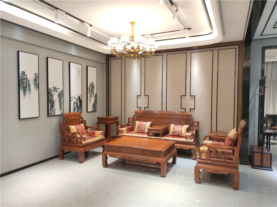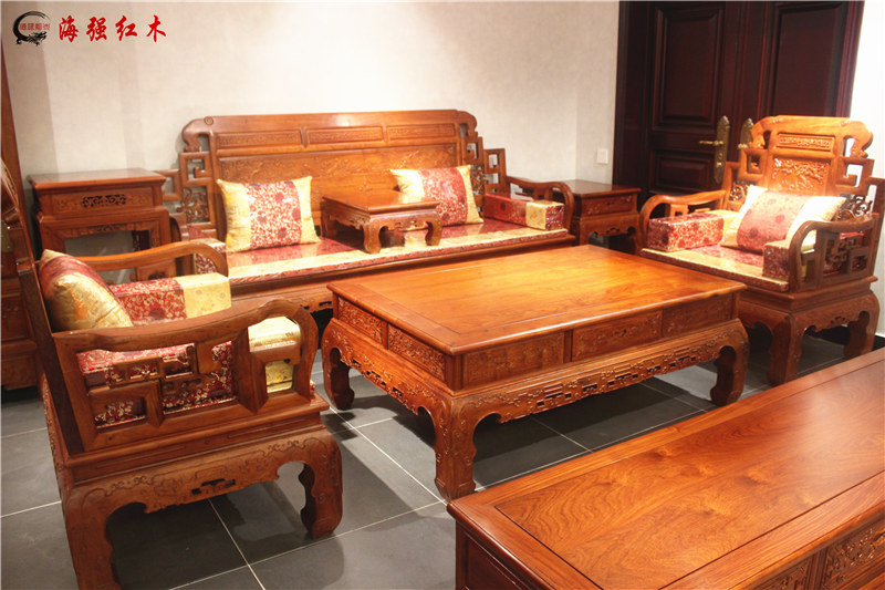 六合同春沙發緬甸花梨木家具件數:十一件套 (圖片中展示為7件套)尺寸:三人位215*65*41*108cm ?單人位:90*65*41*108cm ?大平幾:153*105*50cm ?高花幾:48*48*88cm ?高幾58*50*63cm ?小炕幾55*40*22cm六合同春的由來:六合同春又名鹿鶴同春,古代中國寓意紋祥之一。六合是指天地四方(