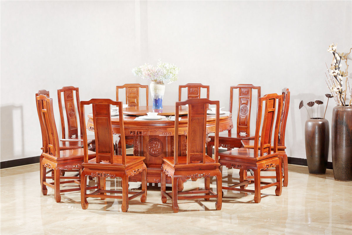 名稱:海強一號餐桌材質:緬甸花梨木件數:九件套 座椅*8 桌子*1尺寸:桌面直徑133-79cm/153*79cm可選購買咨詢更多款式請聯系倪蘭香:137-7792-2843微信號:137-7792-2843