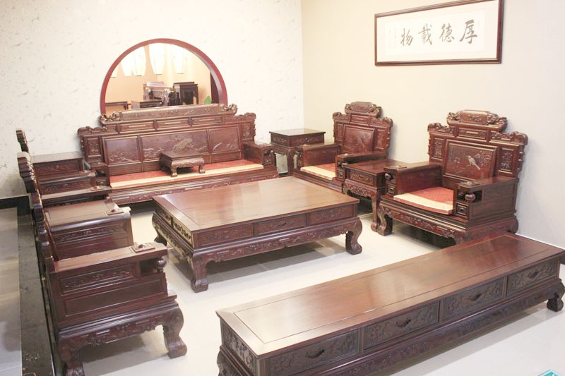 首先來(lái)張全景大圖,這是黑酸枝制作的財(cái)源滾滾沙發(fā)十一件套(不含電視柜喲)怎么樣?這樣大氣的紅木家具擺在家里是不是被顯面子!  高端,大氣!