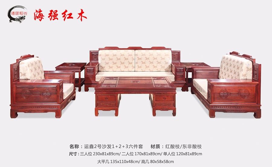 運鑫沙發2號 1+2+3六件套沙發名稱:運鑫 2 號沙發 1 + 2 + 3 六件套材質:紅酸枝/東非酸枝尺寸:三人位 2 30x81x89cm /二人位 170x81x89cm /單人位 120x81x89cm 大平幾 13Sxll0x48cm /高幾 80xS8x58cm